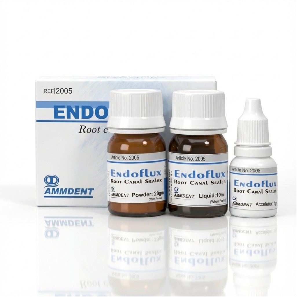 Ammdent Endoflux Root Canal Sealer is a calcium based root canal sealer. An accelerator is provided to decrease the setting time. Composition Zinc oxide Calcium hydroxide Eugenol Iodoform Parachlorophenol Barium sulphate Features Stimulation of the periapical tissues in order to maintain health or promote healing For its antimicrobial effects. Calcium hydroxide denatures...