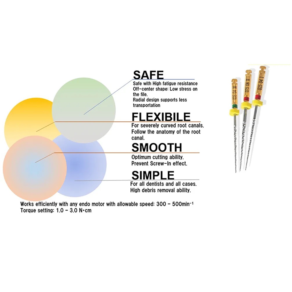 The New Mani Jizai NiTi Rotary File exhibits great flexibility for shaping those severely curved canals with ease and an off-centered rhomboidal cross-section allows even & efficient scrapping of the entire canal wall.JIZAI allows to maintain canal anatomy thanks to its high center ability, features Control Memory & heat treatment that provides greater flexibility with excellent resistance towards micro cracks. Following the anatomy of the root canal-Due to unique heat treatment technology and its cross-section, JIZAI has a significantly low risk of the ledge, transportation, and perforation. Simple sequence with only 3 files- Tip size and taper are written on the shank.