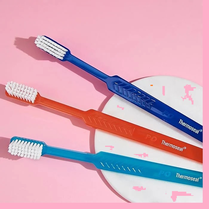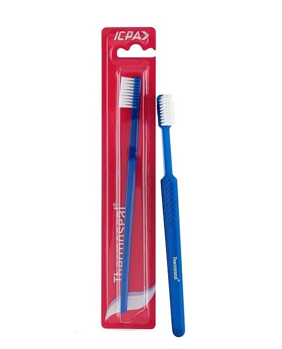 ICPA Thermoseal Manual Toothbrush is designed for sensitive teeth and gums, featuring end-rounded DuPont bristles, a compact head for hard-to-reach areas, and a comfortable, easy-grip handle to reduce pressure during cleaning.