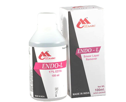 Maarc Endo -L (17% EDTA) is a chelating agent can bind to metals via four carboxylate and two amine groups. It is a polyamino carboxylic acid and a colorless, water-soluble solid, which is widely used to dissolve lime scale. It is produced as several salts, notably disodium EDTA and calcium disodium EDTA. EDTA reacts with the calcium ions in dentine and forms soluble calcium chelates.