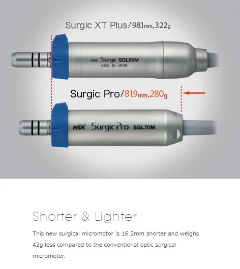 - SHORTER and LIGHER MOTOR: This new surgical micromotor is 16.2mm shorter and weighs 42g less compared to the conventional optic surgical micromotor.