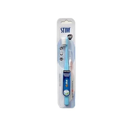 The Stim Plus Ultradense Soft Toothbrush features over 4,500 ultra-soft, tapered bristles for gentle yet effective plaque removal, specifically designed for sensitive teeth and gum tenderness. Its dense, fine bristles reach deep into interdental spaces and along the gum line. It is recommended for daily use, orthodontic patients, and those with enamel concerns.